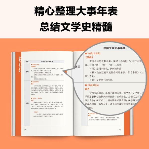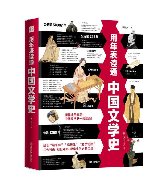 本書為一本方便查詢、適合學生與一般大眾閱讀的中國文學史工具書。全書上起三皇五帝,下迄五四運動與白話文運動,依朝代分七章,每章前有一總說。年表以「時間軸」標示西元、朝代、帝王年號,配以中國文學史事件,包括歷代中國著名作家生卒年、重要事跡、代表作品、文風流派以及創作成就等;世界文學史大事直接對照。收錄近二千位作家,約一百二十則生平故事敘述,七百多條書籍篇章介紹,文學形式、風格、潮流