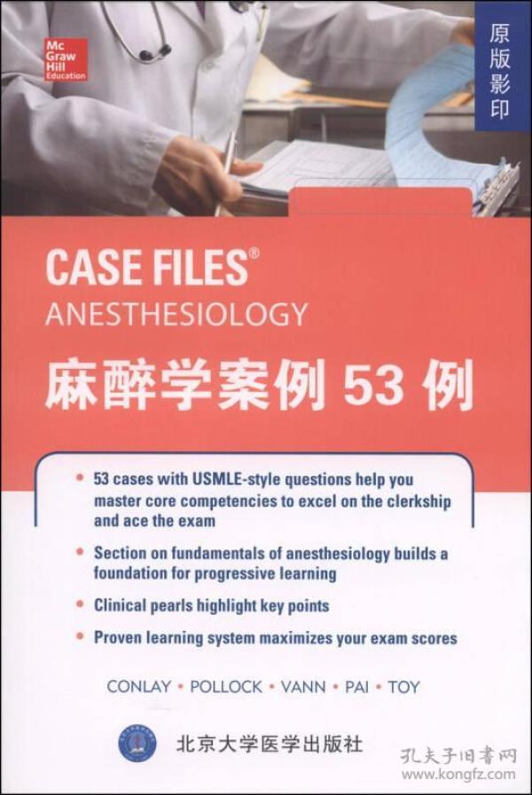 CaseFiles是美國麥格勞—希爾教育出版公司醫學圖書中的著名品牌系列圖書,被世界多所著名醫學院校選定為教學用書。《麻醉學案例53例(原版影印)》的病例都是按照美國醫師執照考試的形式嚴格編寫,對每一個病例有問題、答案和詳細的分析。并有延伸的問題。問題設計精巧,分析透徹,尤其體現了學科之間的交叉。《麻醉學案例53例(原版影印)》可作為醫學院校雙語教學或留學生教學的教材或教學輔導