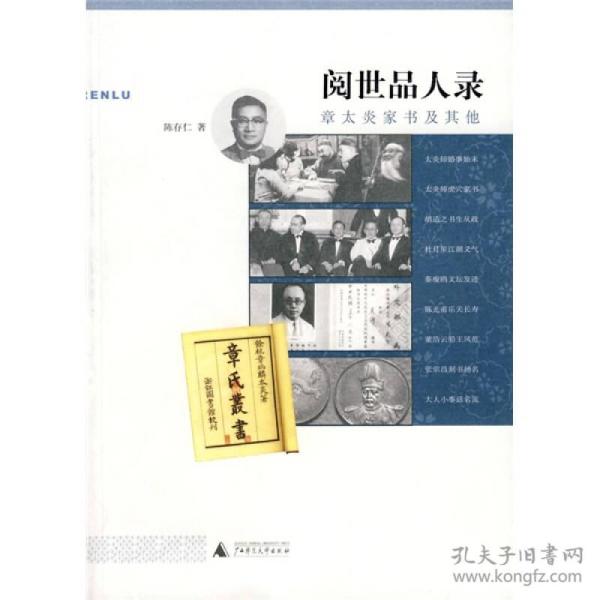 《閱世品人錄(章太炎家書及其他)》是一本記人紀事的書。作者在業醫之余,興趣廣泛,交游廣泛,藏書多,見識多,文筆勤,往往能將自己的游歷和見識水乳交融地融為一篇通俗而又耐讀的文章。 陳存仁,(1908—1990)20世紀三四十年代的上海名醫。原名陳承沅,出生于上海老城廂一衰落綢緞商人家。在上海中醫專門學校畢業后,