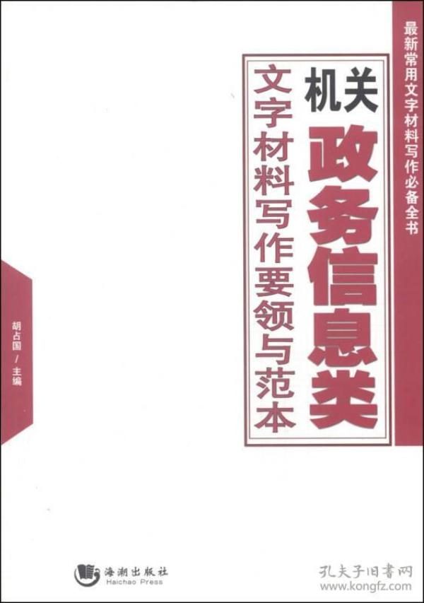 《最新常用文字材料寫作必備全書:機關政務信息類文字材料寫作要領與范本》主要內容包括:政務信息基本知識、政務信息的概念、政務信息的特點、政務信息的作用、政務信息的定位、政務信息應具備的理念、政務信息的基本格式、政務信息與新聞的區別、政務信息的開發與運用、政務信息的特征、政務信息的原則、信息的收集、信息的處理、信息的傳遞、信息的反饋等。