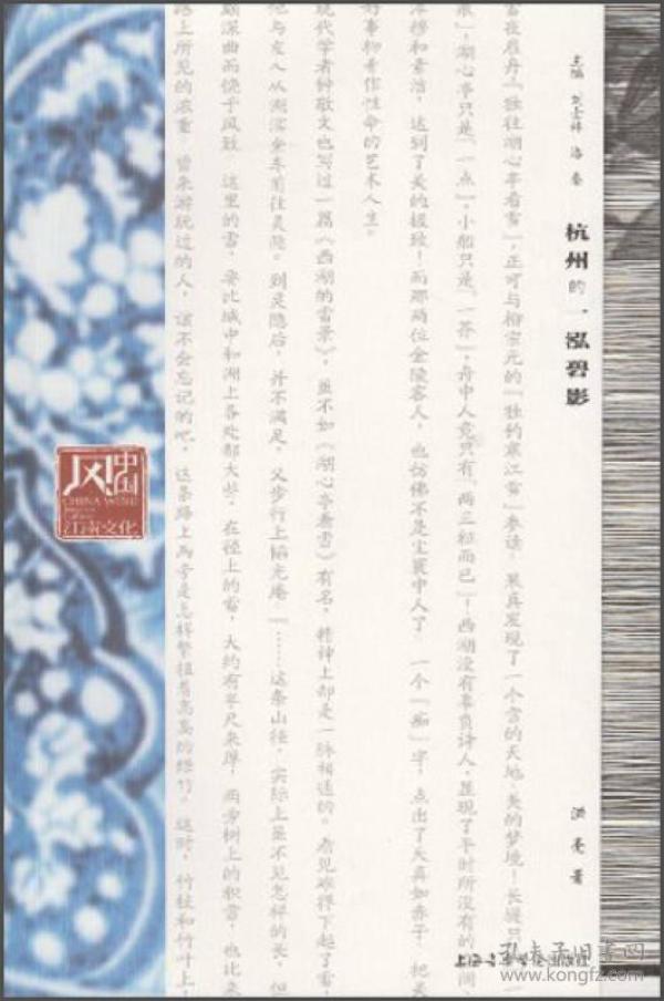 《中國風江南文化:杭州的一泓碧影》以明人田汝成的《西湖游覽志》、《西湖游覽志余》為經,以張岱的《西湖夢尋》為緯,串起《西湖志》、《夢粱錄》、《武林舊事》、《四時幽賞錄》等二十余種史籍,加之以詩詞小說、現當代游記,多層次、多側面地向讀者呈現了一個豐美的、人文化的西湖,在綺羅香澤、櫓聲光影里,努力發掘江南文化柔情俠骨的底蘊,《中國風江南文化:杭州的一泓碧影》可作為杭州西湖的高品位導